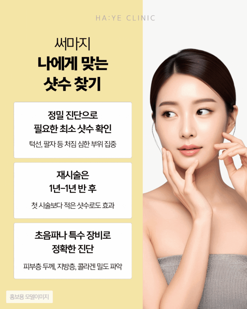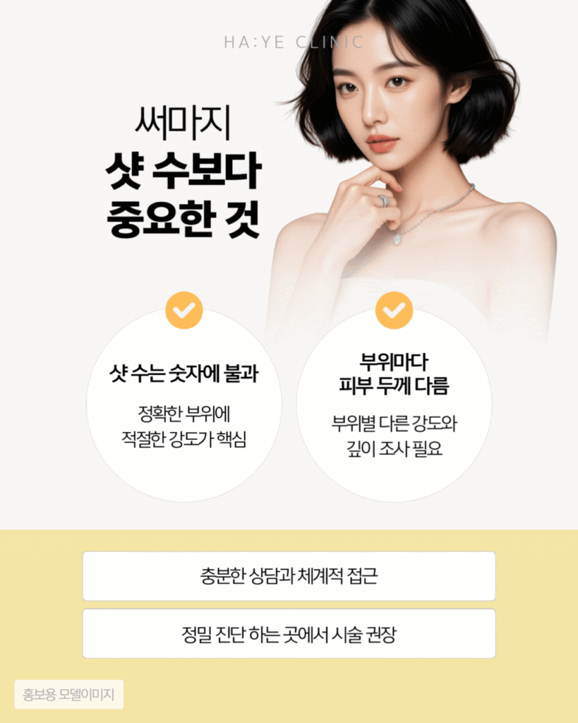 진료실에서 느끼는 건, 단순히 샷 수가 많다고 좋은 게 아니라는 걸 모르시는 경우가 의외로 많다는 거예요. 써마지는 정확한 진단과 개인별 맞춤 계획이 훨씬 더 중요하거든요.