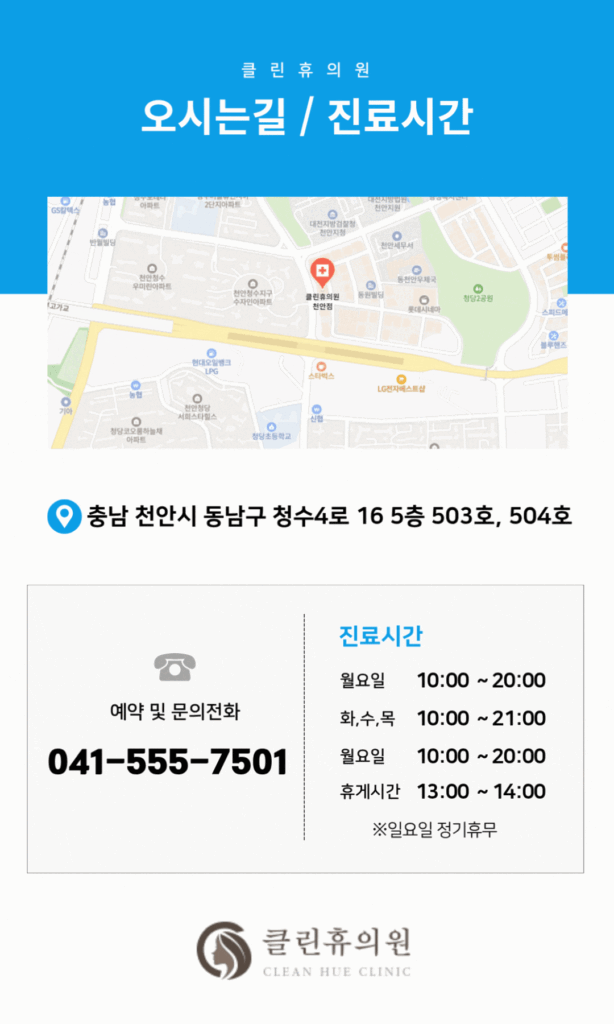 그래서 저는 언제나 1:1 상담을 통해 궁금한 점을 직접 확인하고, 본인에게 딱 맞는 방법을 함께 찾아가는 걸 추천드려요. 글만 보고 결론 내리기보다는, 상담을 통해 직접 확인해 보시는 게 가장 확실하니까요. 클린휴의원에서 편하게 문의 주세요.