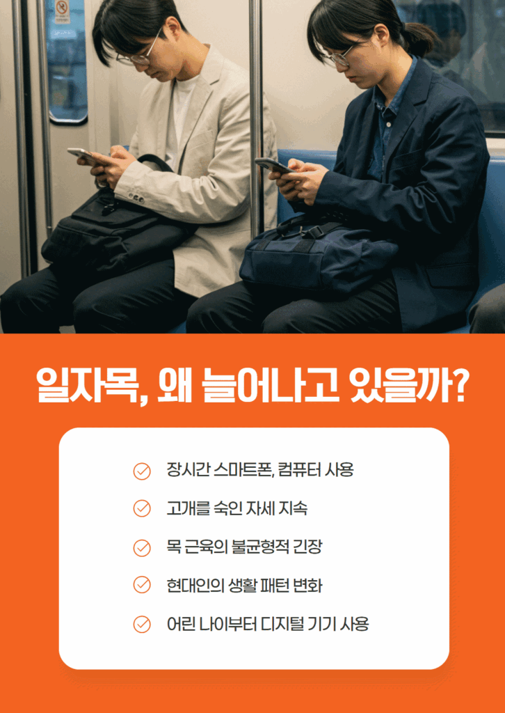 하지만 막상 검사를 해보면 ‘일자목’인 경우가 정말 흔합니다. 도대체 왜 일자목이 이렇게 많아진 걸까요?