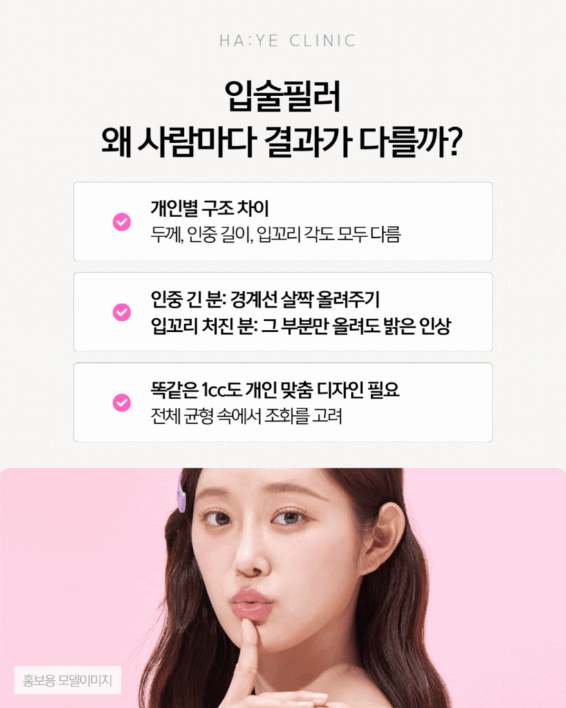 예를 들어 인중이 긴 분이 윗입술에 과도한 볼륨을 넣으면 더 길어 보일 수 있어요.그럴 땐 경계선을 살짝 올려주면서 적절히 주는 게 훨씬 자연스럽죠.