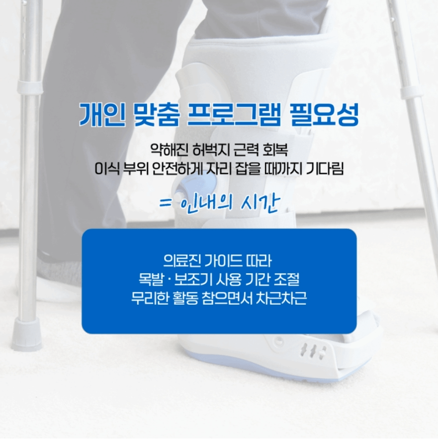 같은 수술을 받으셨어도 회복의 흐름은 저마다 다를 수 있어요. 근육량, 통증에 대한 민감도, 뼈대 구조, 평소 활동 수준이 모두 영향을 미치기 때문입니다. 기본 원리는 비슷하지만, 세부적인 진행 속도와 강도는 각자의 상태에 맞게 조율해야 합니다.