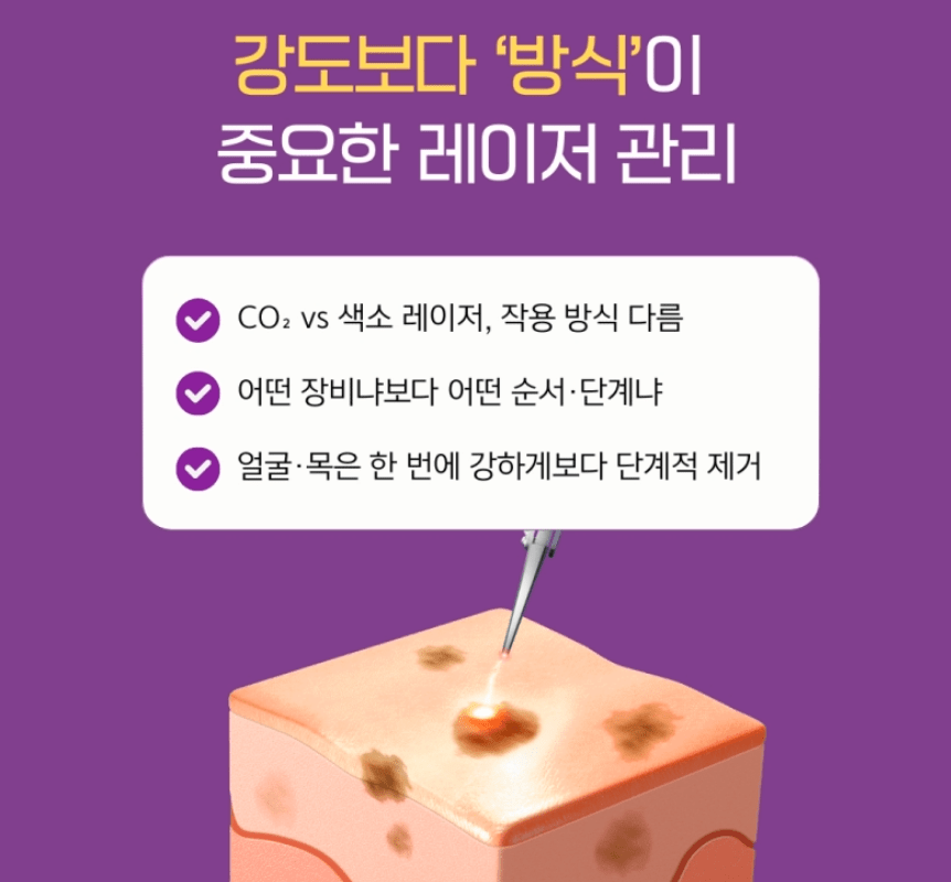 특히 얼굴이나 목처럼 다운타임이 길어질까 봐 신경 쓰이는 부위는 한 번에 강하게 없애기보다, 병변 깊이에 따라 단계적으로 없애는 방식이 부담을 상대적으로 줄이는 선택이 될 수 있습니다.
