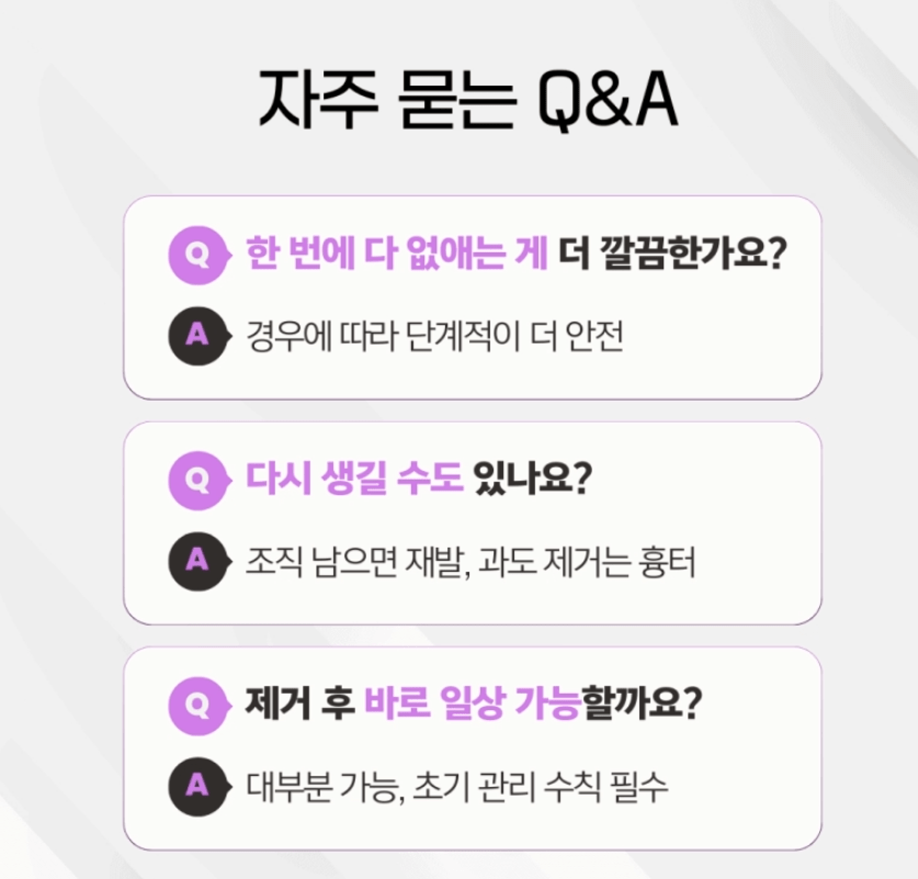 일부 조직이 남아 있으면 시간이 지나 다시 올라오는 경우가 있고, 반대로 필요 이상으로 깊게 없애면 자국이 남을 수 있어요.