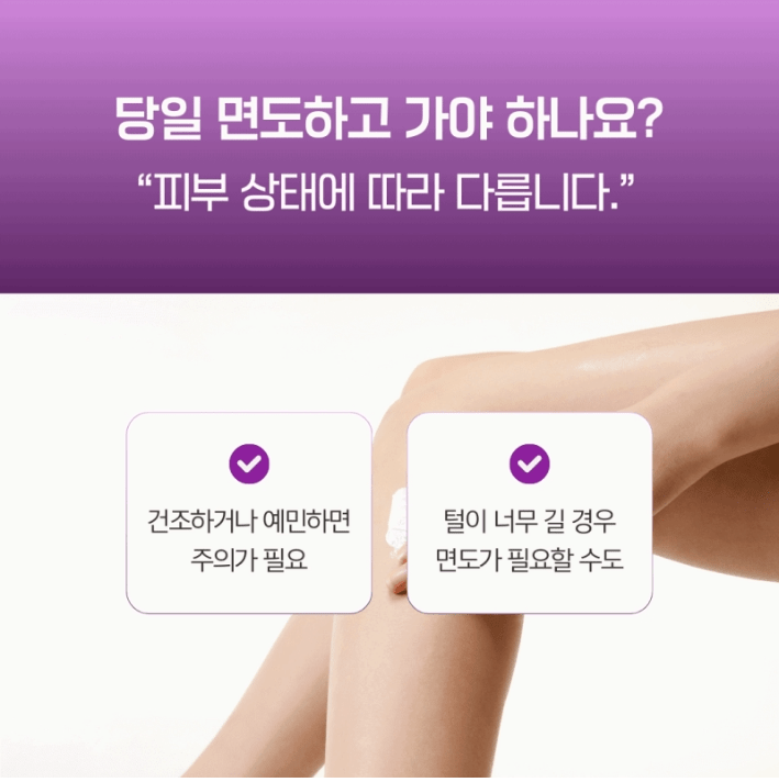 피부가 건조하거나 예민해진 날이라면 면도 자체가 자극으로 작용할 수 있어요. 반대로 털이 많이 자란 상태라면 레이저 반응을 안정적으로 확인하기 위해 면도가 필요한 경우도 생깁니다.