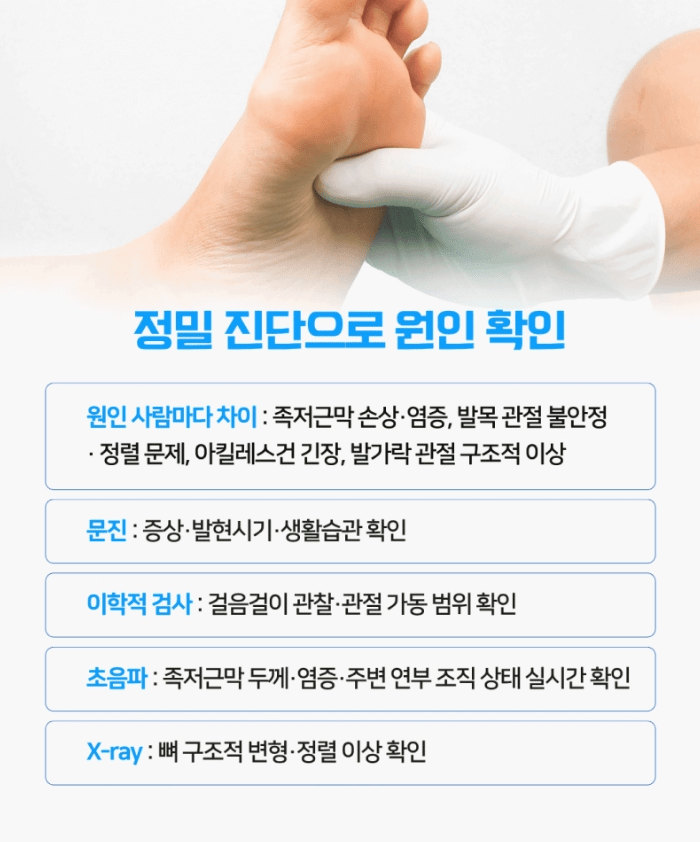 족저근막 자체의 미세한 손상이나 염증일 수도 있고 발목 관절의 불안정성이나 정렬 문제일 수도 있습니다.