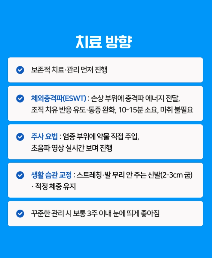염증이 확인된 부위에 약물을 직접 주입하여 족저근막염 증상을 경감시키는 방법입니다.