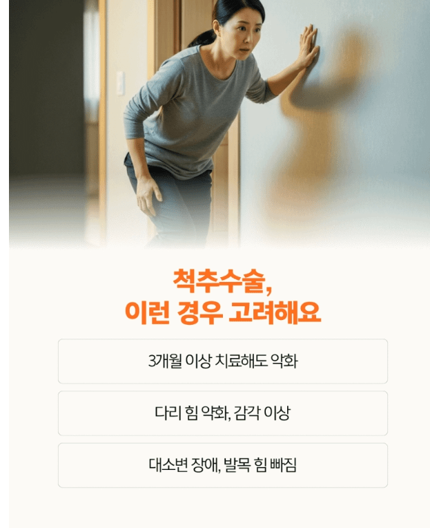 척추 문제로 수술을 고려해야 하는 상황은 이렇습니다.