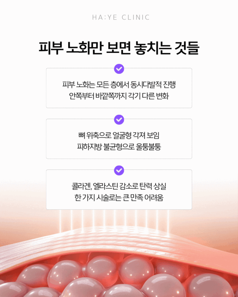 피부 노화는 사람마다 다르잖아요. 볼살 처짐이 고민인 분도 있고, 모공과 잔주름이 신경 쓰이는 분도 있죠. 야외 활동 많으신 분은 자외선 때문에 표면 손상이 심하고, 스트레스 많으신 분은 전체 탄력 저하가 빨라요.