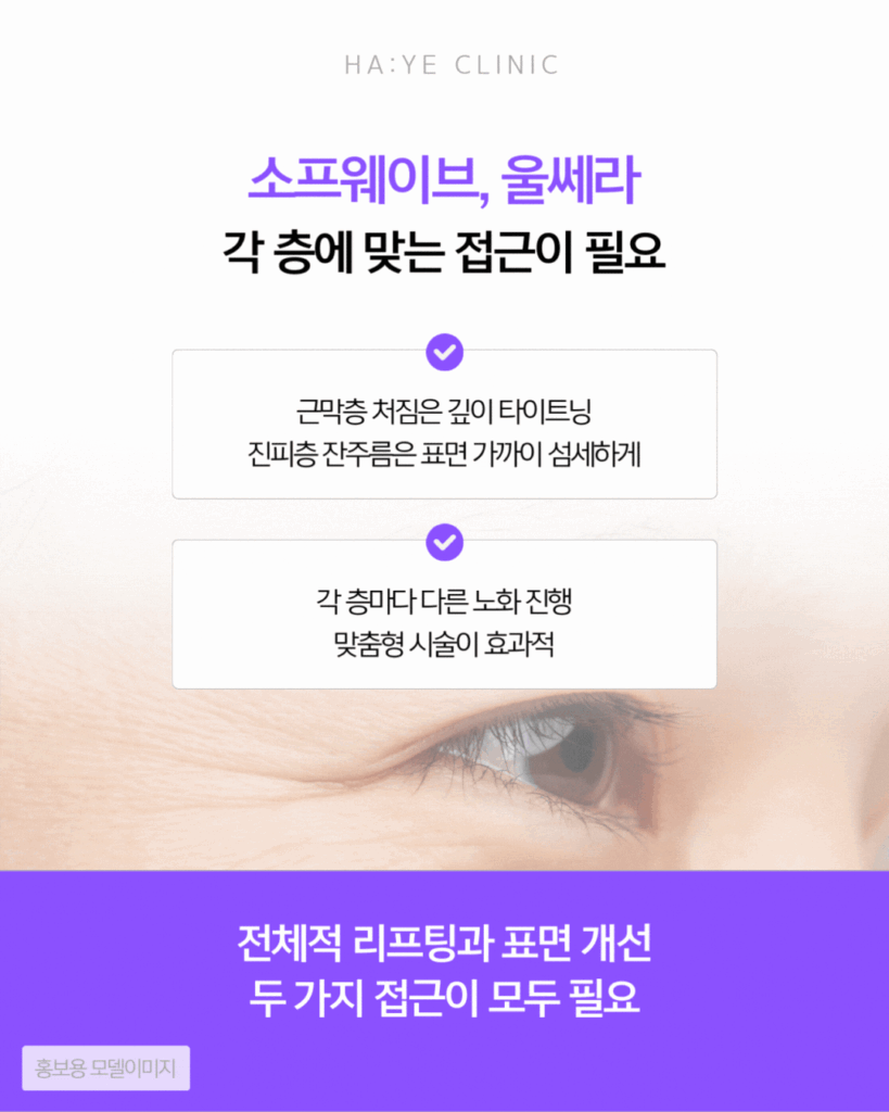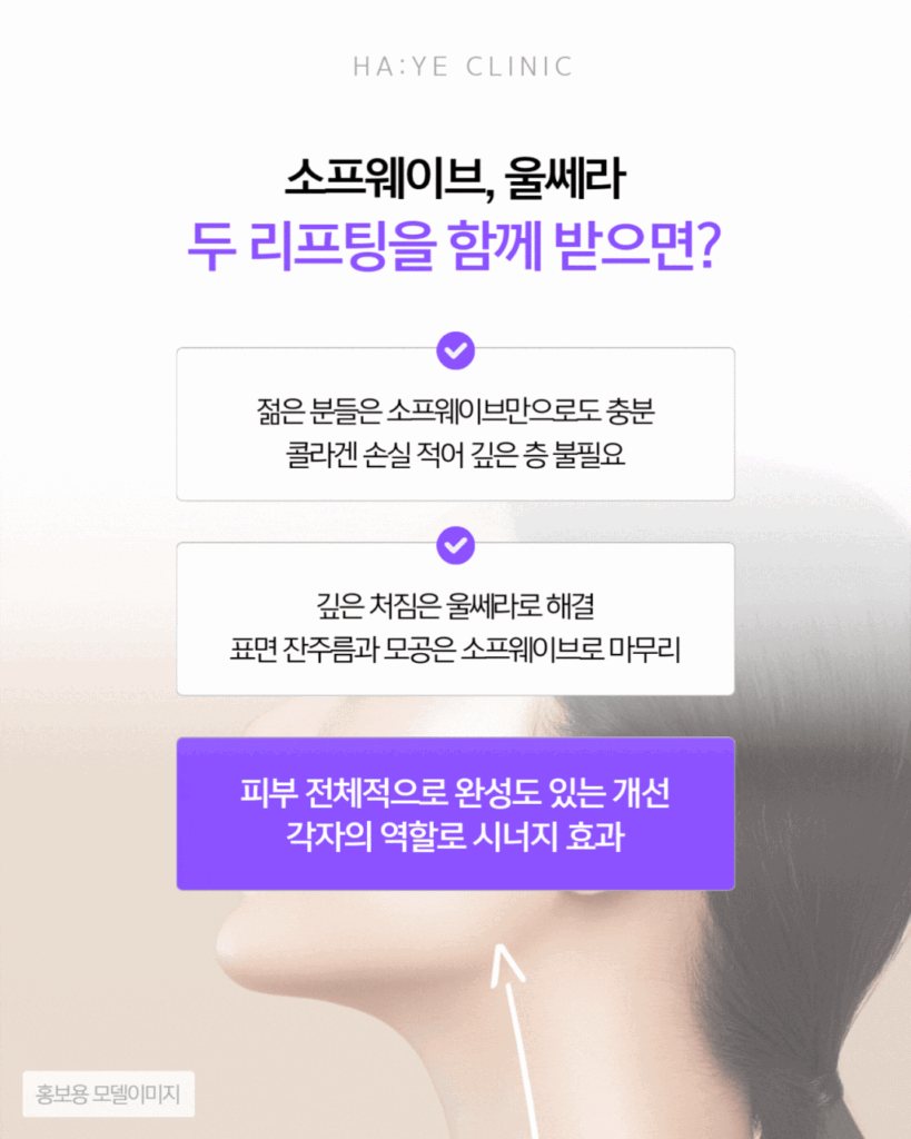 하지만 깊은 처짐은 울쎄라로 잡고, 표면 잔주름과 모공은 소프웨이브로 마무리하면 피부가 완성도 있게 변신해요.