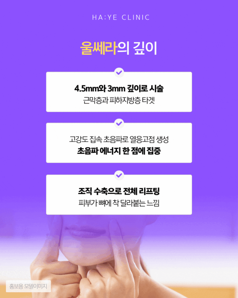 울쎄라는 4.5mm와 3mm 깊이로 들어가요. 근막층과 피하지방층을 타깃으로 고강도 집속 초음파로 열 응고점을 만들죠.