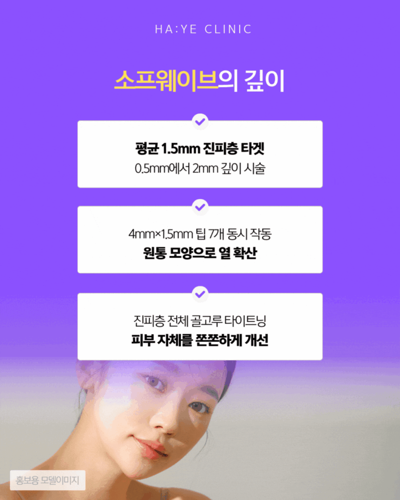 반면 소프웨이브는 평균 1.5mm, 그러니까 0.5mm에서 2mm 깊이의 진피층을 타깃으로 해요. 작은 팁 7개가 동시에 초음파를 쏘면서 원형으로 열을 확산시켜요.