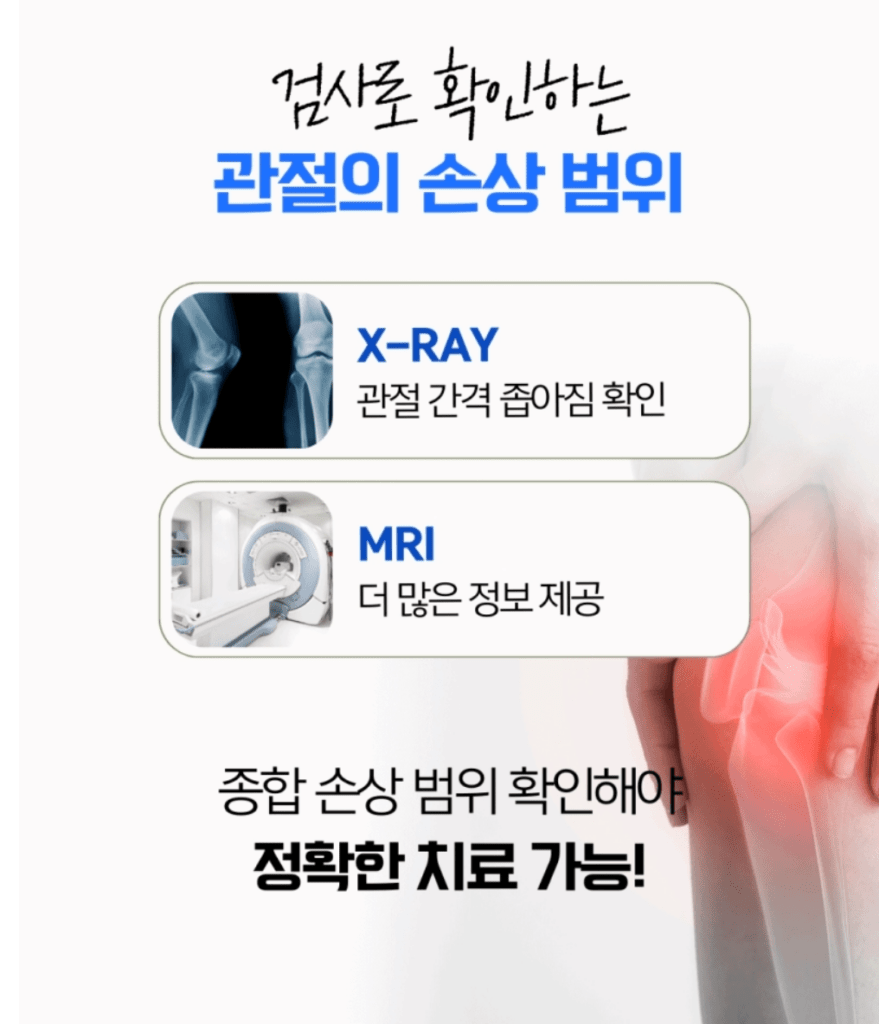 엑스레이 검사에서 관절 간격이 좁아진 것이 보이면 연골이 닳았다는 의미예요. 그런데 MRI 검사를 추가로 진행하면 인대 손상 정도, 근육 위축 상태, 염증 범위까지 더 폭넓게 파악할 수 있습니다. 손상 범위를 명확하게 확인해야 어떤 방식의 접근이 필요한지 제대로 판단할 수 있어요.