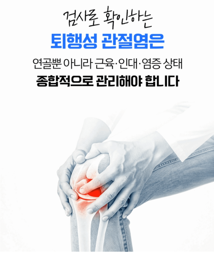 퇴행성관절염은 단기간에 끝나는 질환이 아니에요. 장기적인 시각으로 접근해야 하며, 연골뿐 아니라 근육, 인대, 염증 상태를 함께 살펴야 합니다.