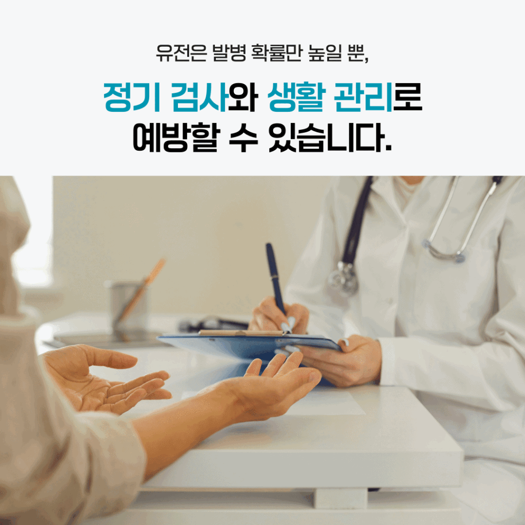 그러니 가족력이 있다고 너무 겁먹지 않으셔도 됩니다. 오히려 이를 미리 아는 것은 예방과 조기 발견의 기회가 될 수 있습니다. 정기적으로 건강 상태를 체크하고 위험 요인을 피하며 생활한다면 발병을 늦추거나 예방할 가능성도 충분히 있습니다.