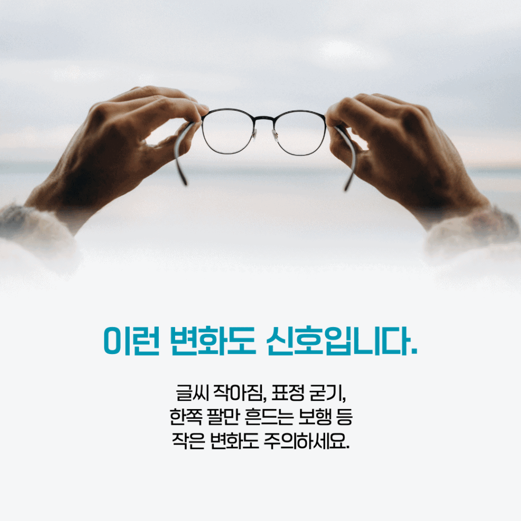 또한 우울감이나 무기력함, 예전에 즐기던 취미에 흥미를 잃거나 사람 만나는 게 귀찮아지는 변화도 중요한 신호입니다. 글씨가 점점 작아지거나, 걸을 때 한쪽 팔이 덜 흔들리고, 표정이 굳어지는 것도 미세한 변화들입니다.