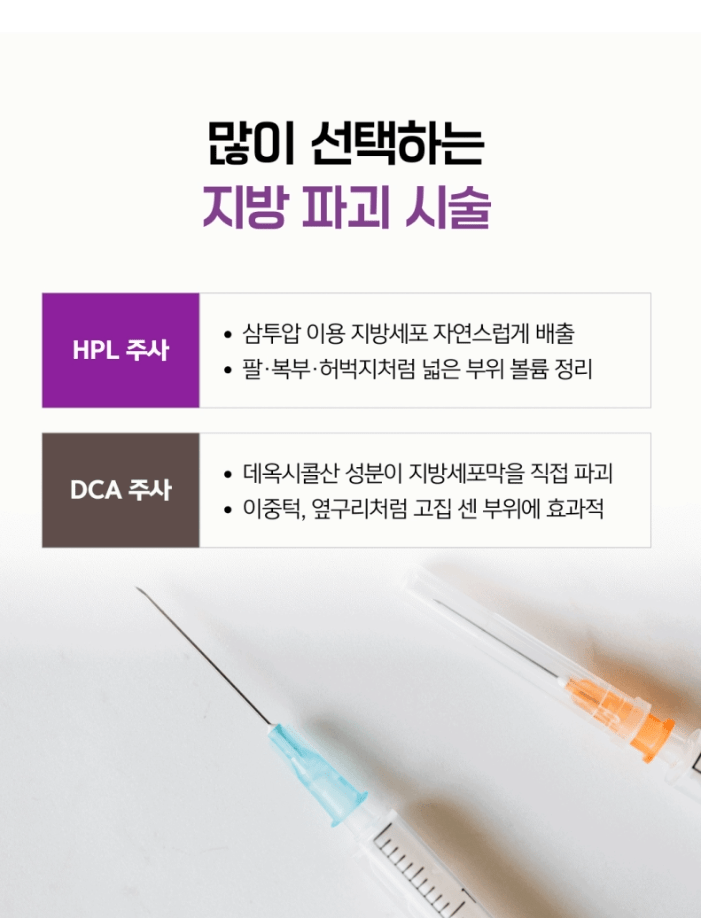 HPL 주사는 삼투압 원리를 활용해 지방세포를 부풀린 뒤 자연스러운 배출을 유도합니다. 팔이나 복부, 허벅지처럼 면적이 넓은 부위의 볼륨 정리에 주로 쓰여요.