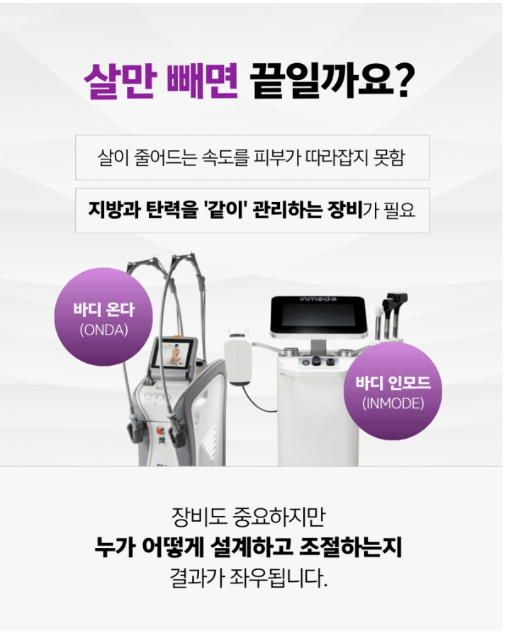 같은 장비라도 지방 두께, 탄력 저하 부위, 붓기 성향에 따라 강도와 순서, 조합이 달라지기 때문이에요.