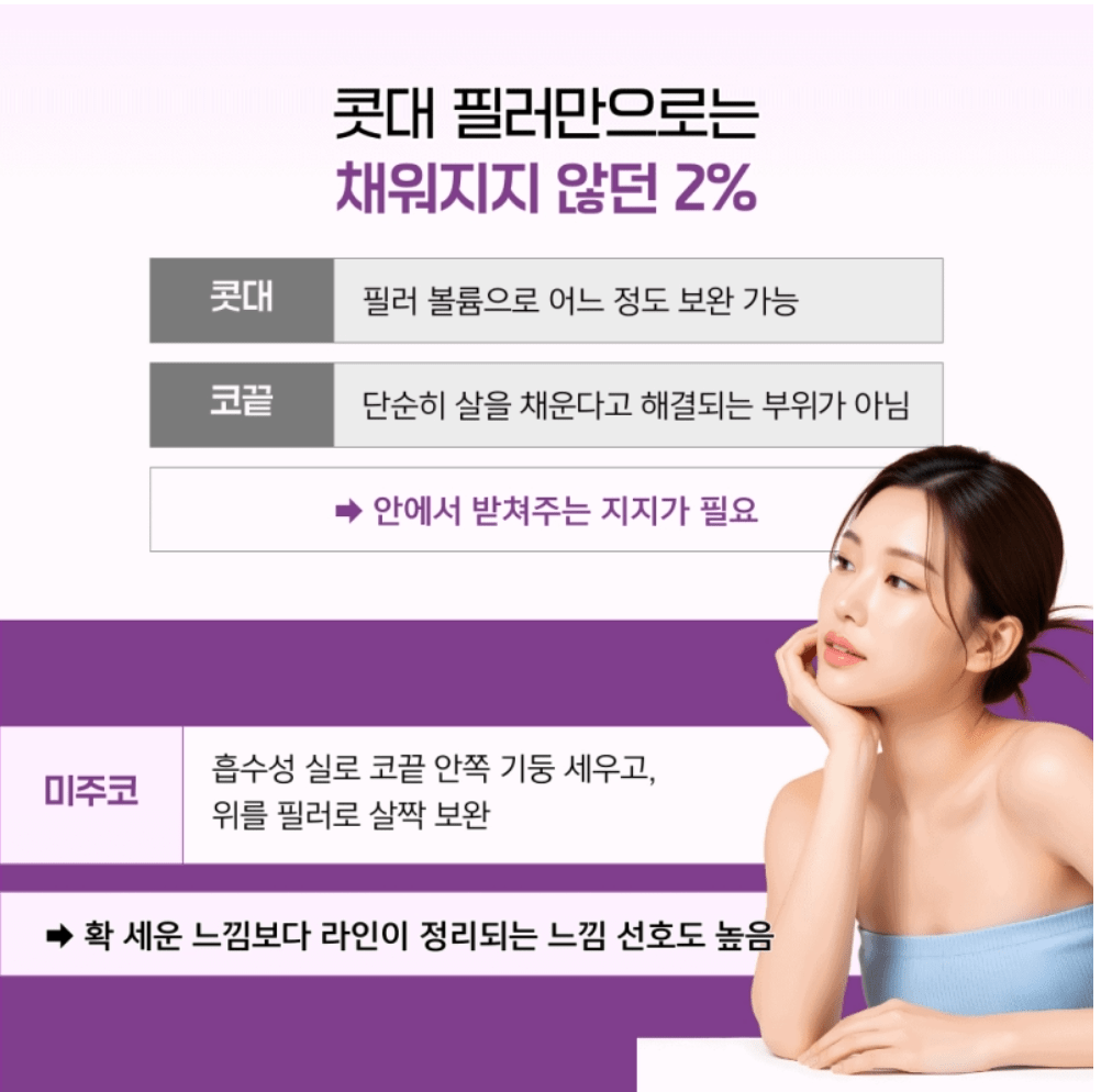 이럴 때 언급되는 방법이 바로 ‘미주코’입니다. 흡수되는 의료용 실을 코끝 안쪽에 세워 지지 역할을 하게 한 뒤, 겉라인은 필러로 가볍게 보완하는 방식이에요. 확 세운다는 느낌보다 라인이 자연스럽게 정리되는 변화가 나타나서 과하지 않은 결과를 원하시는 분들께 선호도가 높습니다.