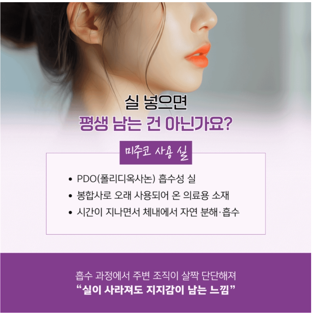 미주코에 쓰이는 실은 PDO(폴리디옥사논) 소재입니다. 오래전부터 외과 봉합사로 사용돼 온 재료로, 시간이 지나면서 몸 안에서 자연스럽게 분해되고 흡수되는 특성을 가지고 있어요.