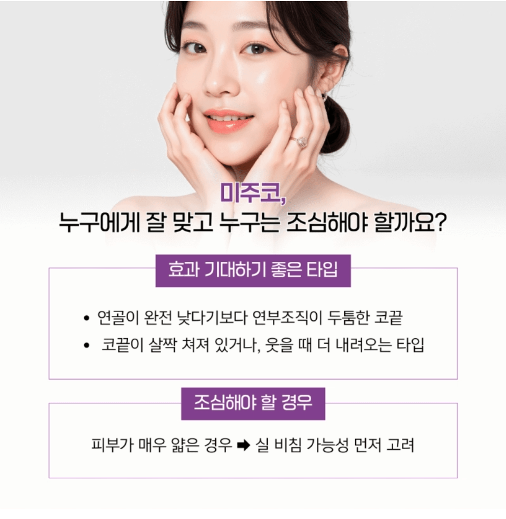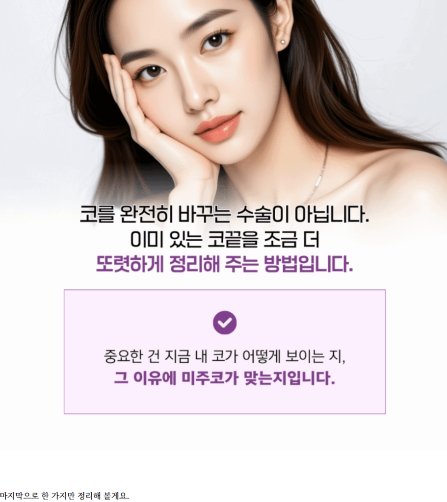 미주코는 코를 완전히 바꾸는 방법이 아닙니다. 이미 가진 코끝 라인을 조금 더 또렷하게 다듬는 방식에 가까워요.