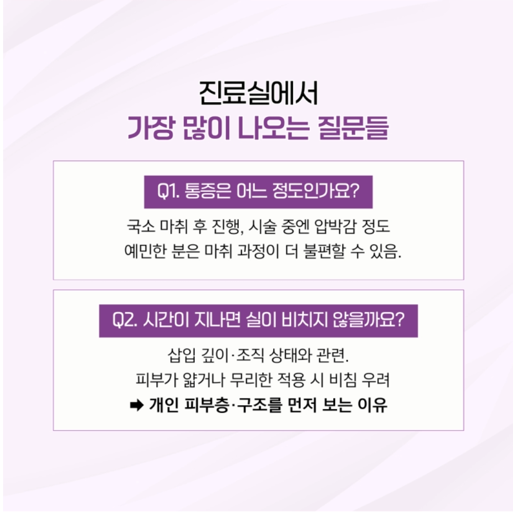 Q. 시간이 지나면 실이 비치지 않을까요? 삽입 깊이나 조직 상태와 연관될 수 있는 부분입니다. 피부층과 구조를 먼저 살피는 이유가 여기에 있어요. 흡수되는 소재를 사용하는 것 역시 이런 가능성을 고려한 선택입니다.