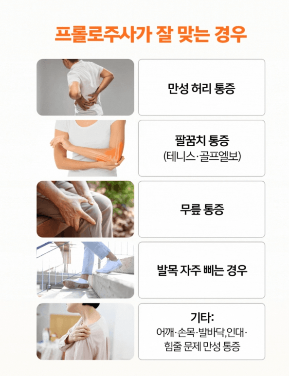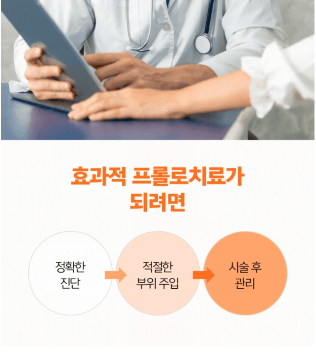 결국 프롤로주사 치료는 정밀한 진단 → 정확한 위치 투여 → 체계적인 사후 관리가 함께 이루어져야 최적의 효과를 기대할 수 있습니다.
