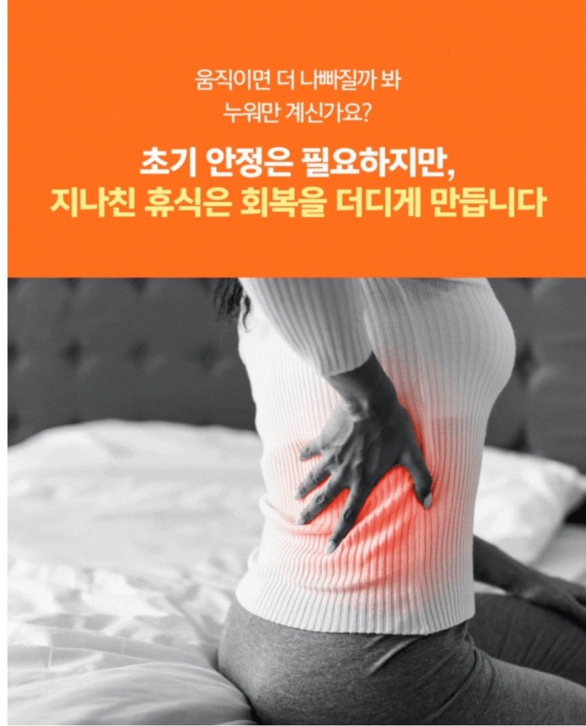그런데 여기서 놓치기 쉬운 사실이 있어요. 일주일, 한 달씩 누워만 계시면 회복이 오히려 더뎌진다는 점입니다. 사용하지 않은 근육은 생각보다 빠르게 약해져요. 특히 척추를 받쳐주는 심부 근육은 며칠만 활동을 멈춰도 힘이 눈에 띄게 떨어지는데, 그렇게 되면 디스크에 가해지는 부담이 커지게 됩니다.