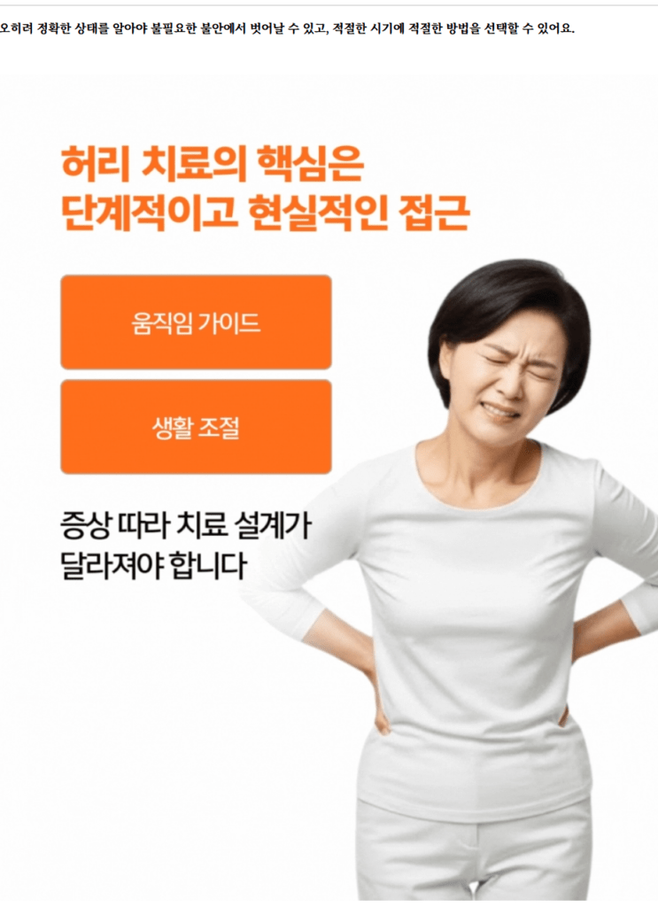 허리디스크는 무조건 수술해야 하는 질환도 아니고, 그렇다고 참고 버티면 해결되는 것도 아닙니다. 정밀한 진단을 통해 본인 상태를 제대로 파악하고, 그에 맞는 단계적인 접근이 필요한 질환이에요.