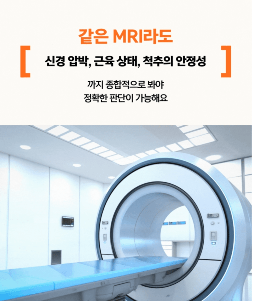 영상 판독의 깊이가 다릅니다. 동일한 사진을 보더라도, 디스크 돌출 정도만 확인하는 경우와 신경 압박, 척추 불안정성, 주변 근육 상태까지 함께 살피는 경우는 결론이 달라질 수밖에 없어요. 경험 많은 의료진이 봐야만 보이는 미세한 변화들이 있습니다.
