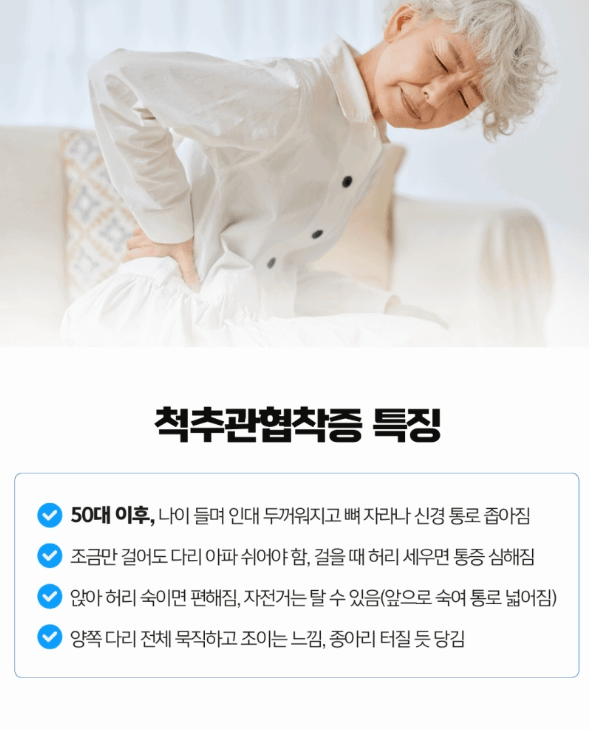 보행 시 허리를 곧게 펴면 신경이 눌려 통증이 심해지고, 앉아서 허리를 숙이면 오히려 편안해져요.