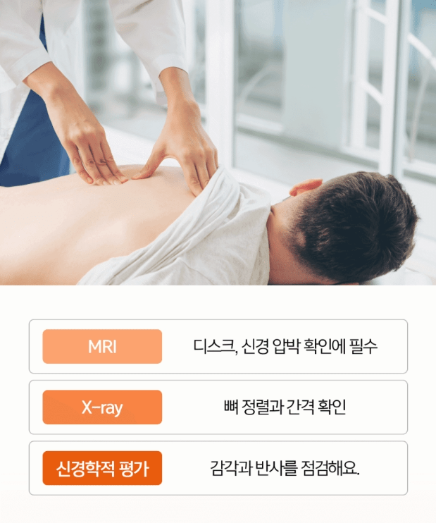 MRI: 추간판 상태, 신경 눌림 정도, 협착 유무 파악