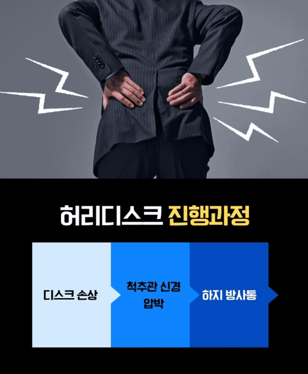 탈출된 수핵은 염증 반응을 일으키고, 이로 인해 허리는 물론 엉덩이와 다리까지 퍼지는 하지 방사통이 나타나게 되죠.