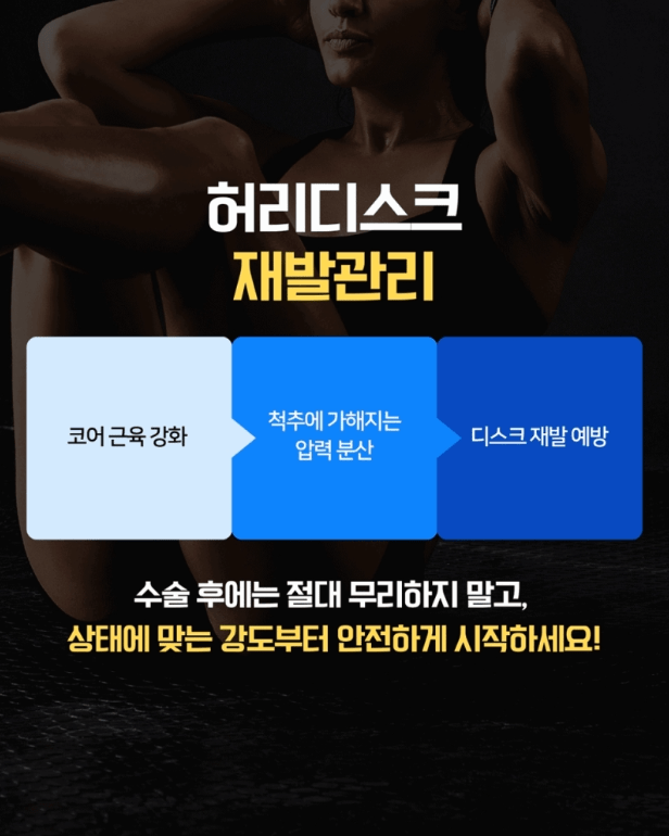 코어가 강해지면 척추에 가해지는 부담을 분산시켜 재탈출을 예방할 수 있기 때문이에요.