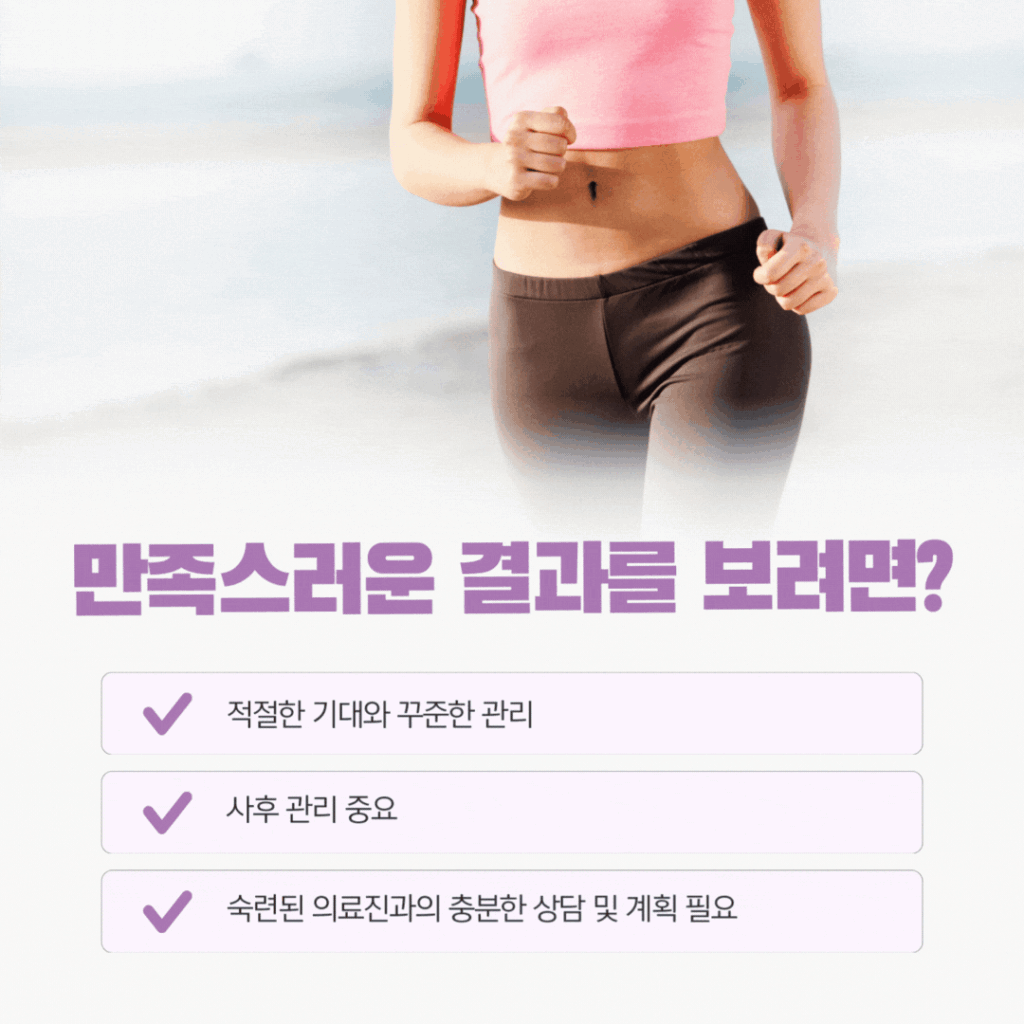 숙련된 의료진과의 충분한 상담, 신중한 계획, 체계적인 관리가 함께한다면 여러분이 오랫동안 꿈꿔왔던 이상적인 하체 라인을 현실로 만들 수 있어요. 각자의 체형과 라이프스타일에 맞는 최적의 방법을 찾아 더 자신감 있고 활기찬 일상을 만들어가시길 응원합니다!