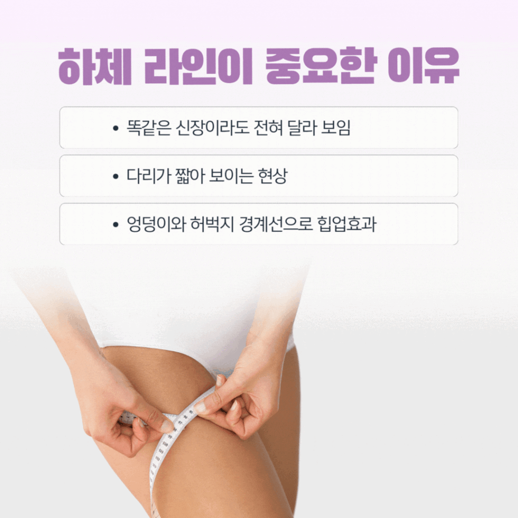 같은 키라도 하체 모양에 따라 사람의 인상이 완전히 달라져요. 허벅지 외측이 툭 튀어나오거나 내측이 두툼하면 몸 전체가 둔해 보일 수 있죠.