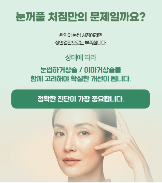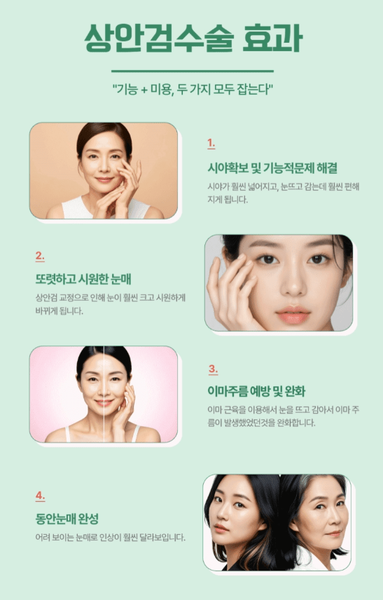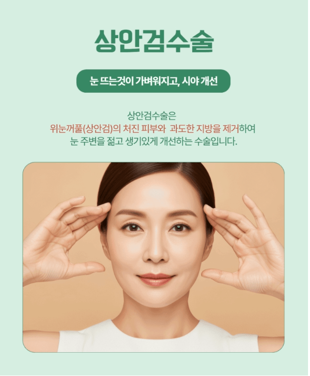 처진 피부가 단순히 나이 들어 보이는 것만 문제가 아니라, 실제로 시야를 막고 일상생활에 불편을 주거든요.